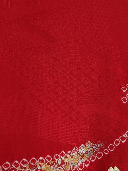 生地に御所車などの地模様が入った、赤地の高級産着です。柄に施された高級刺繍や、絞り染めの流水柄が上品で高級感あふれる一品です。