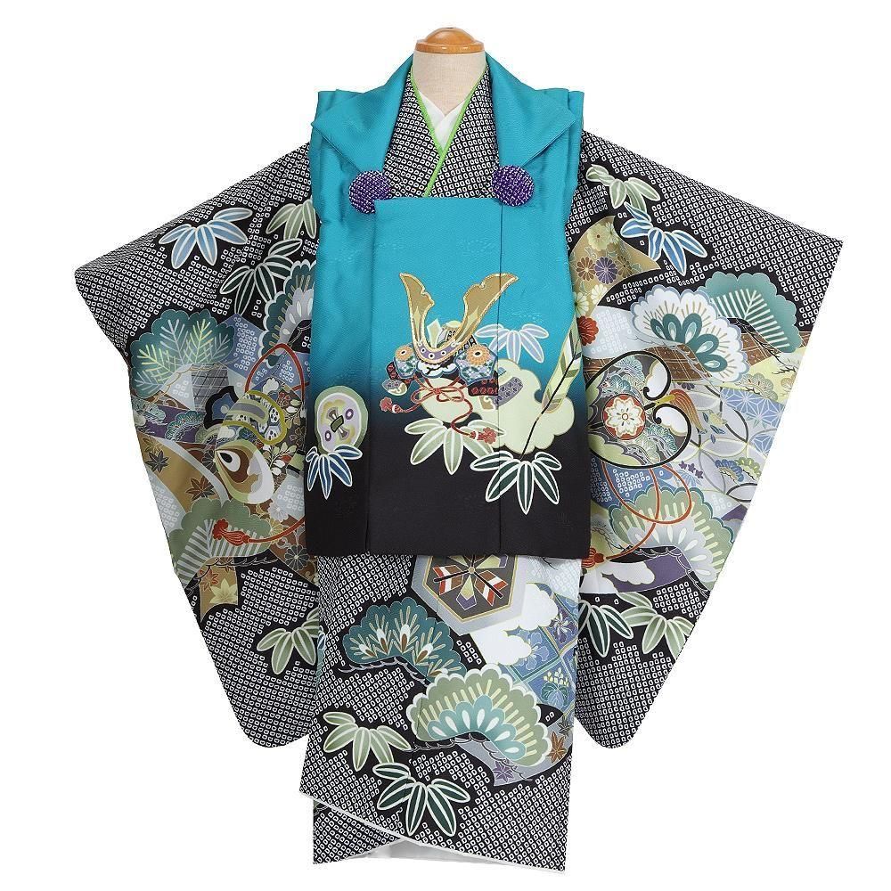 【七五三男児3歳被布レンタルセット】753B3-04 黒疋田×ブルーグリーン 兜【往復送料無料】