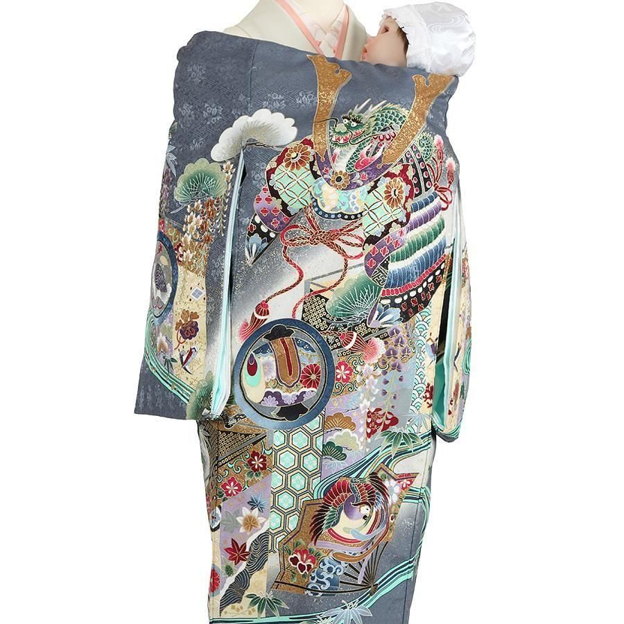 【男児お宮参りレンタル初着(産着)】B214 グレー地 兜 流水【往復送料無料】