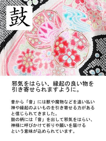 本絞りで染められた黒と赤に、優しい色合いで染められた可憐な花々と、金駒刺繍が施された鼓が映える逸品です。