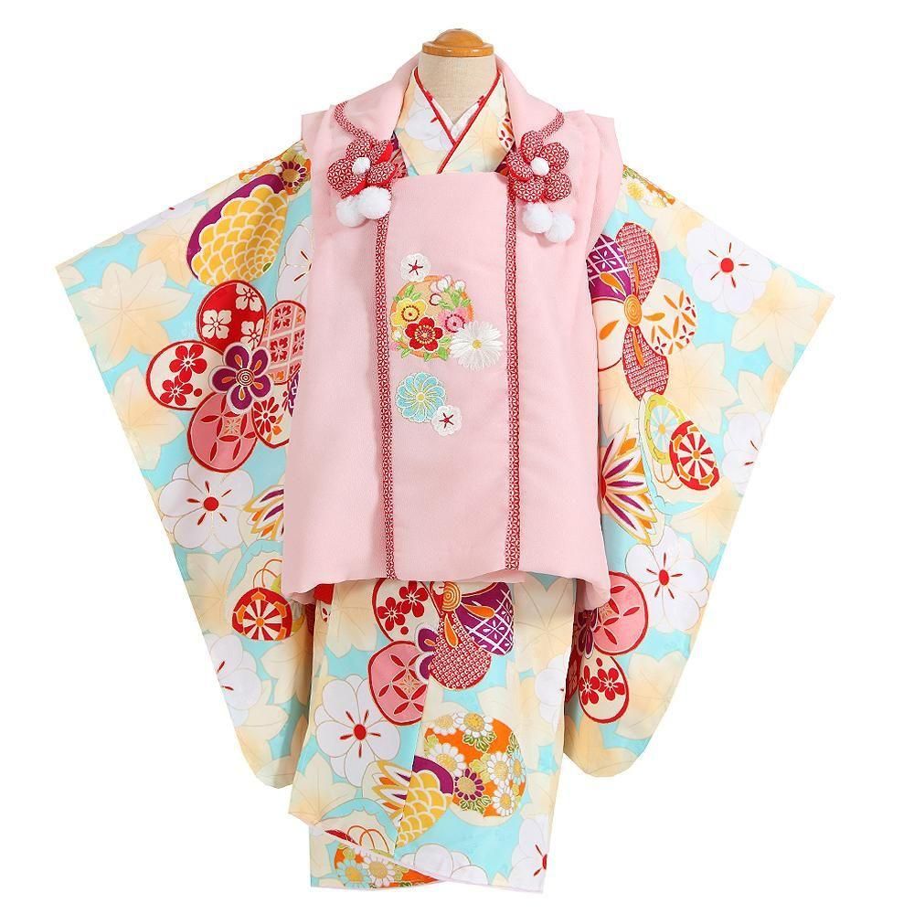 【七五三女児3歳被布レンタルセット】753G3-57 ブランド「小町」水色地 被布薄ピンク【往復送料無料】