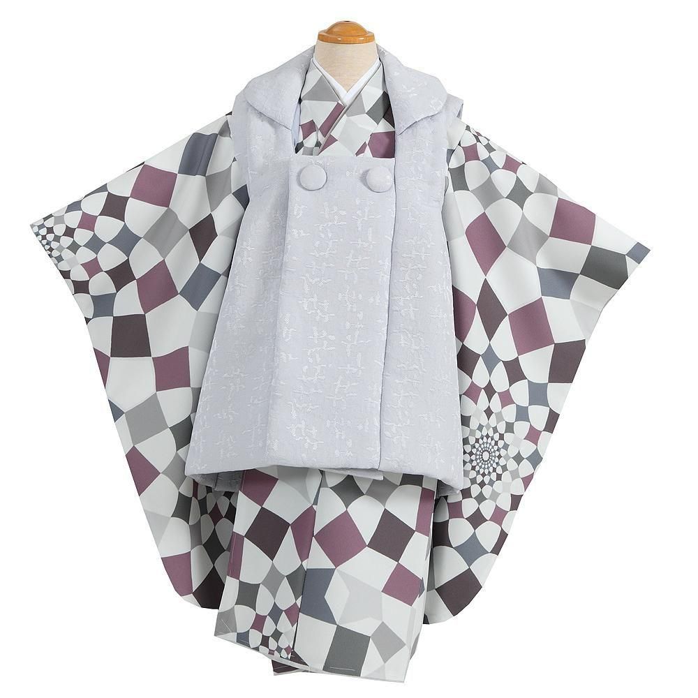 【七五三男児3歳被布レンタルセット】753B3-010 グレー赤茶 幾何学模様×薄グレー【往復送料無料】