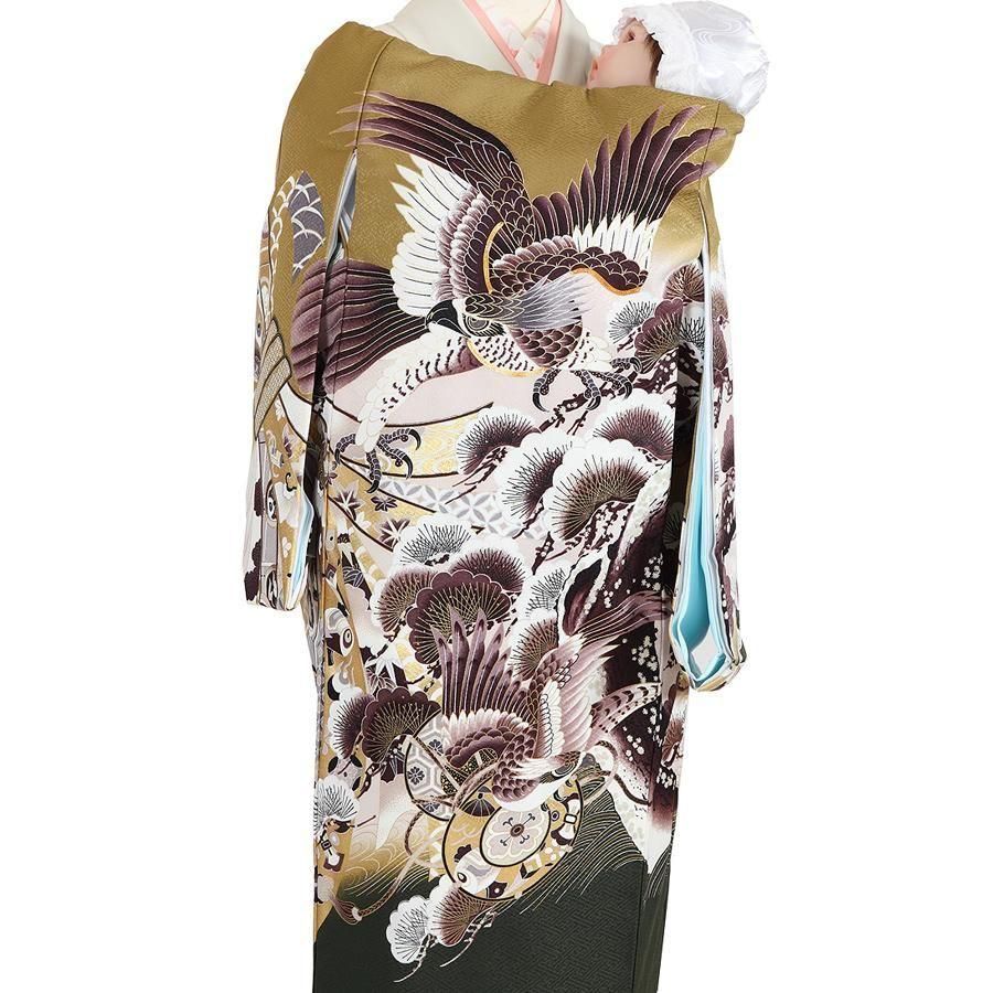 【男児お宮参りレンタル初着(産着)】B227 桑茶色 裾緑地 鷹 束ね熨斗【往復送料無料】