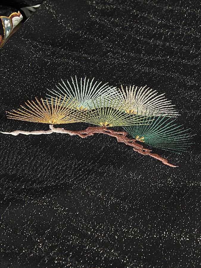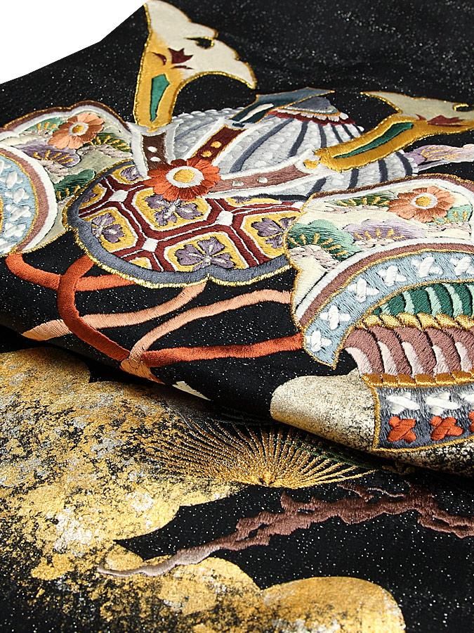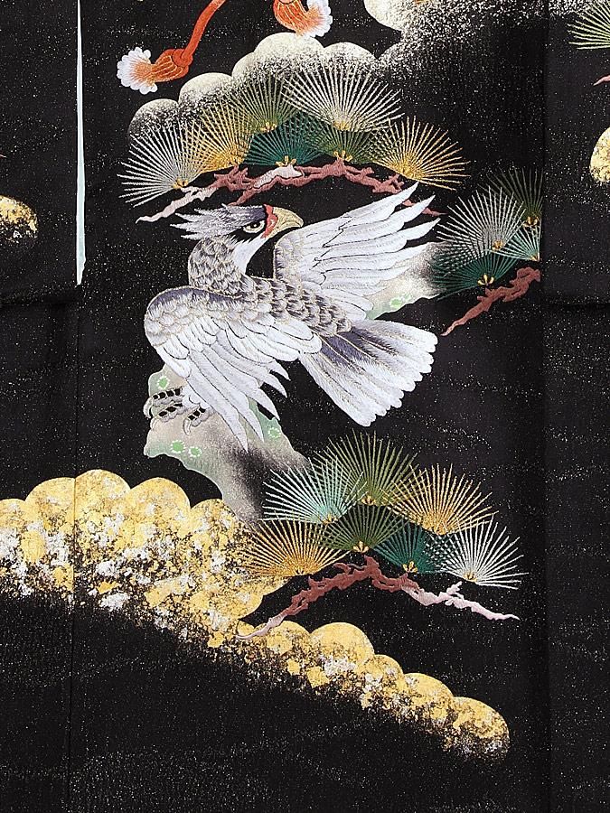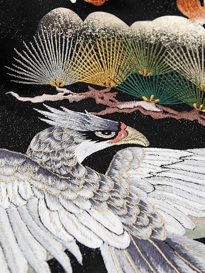 その様な生地に高級刺繍で描かれた兜や鷹、松が映える逸品です。