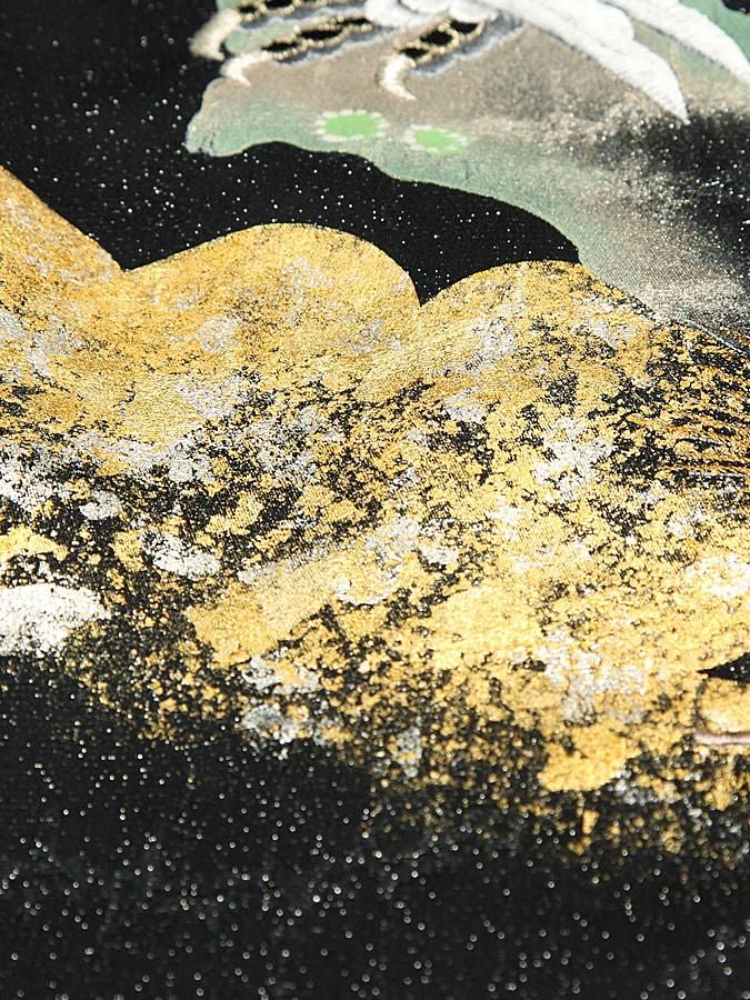 手染めされた生地は金糸が織り込まれており、金銀箔押しの金彩加工が相まって、煌びやかで豪華な一枚。