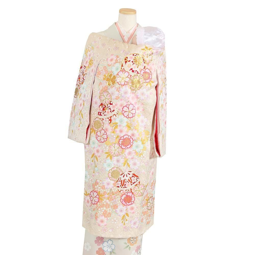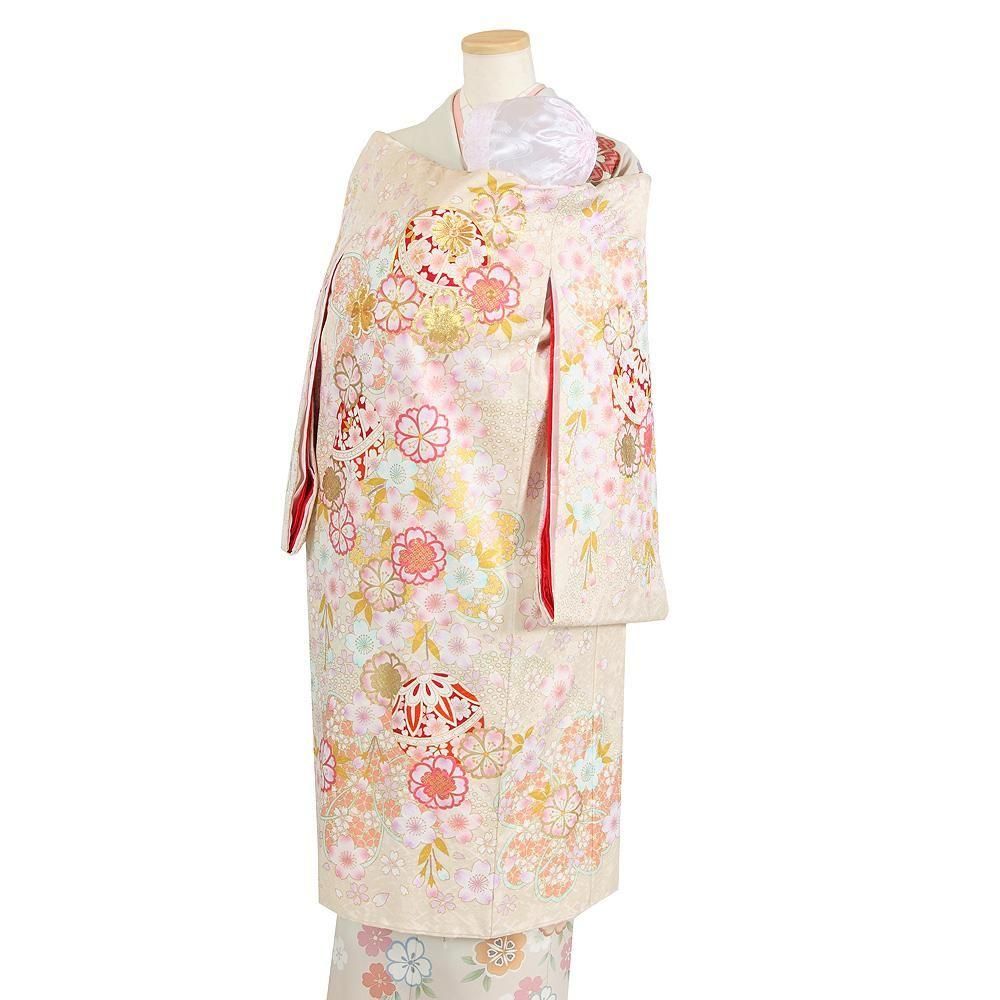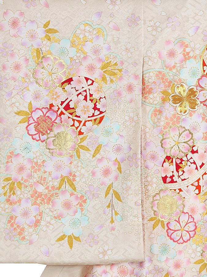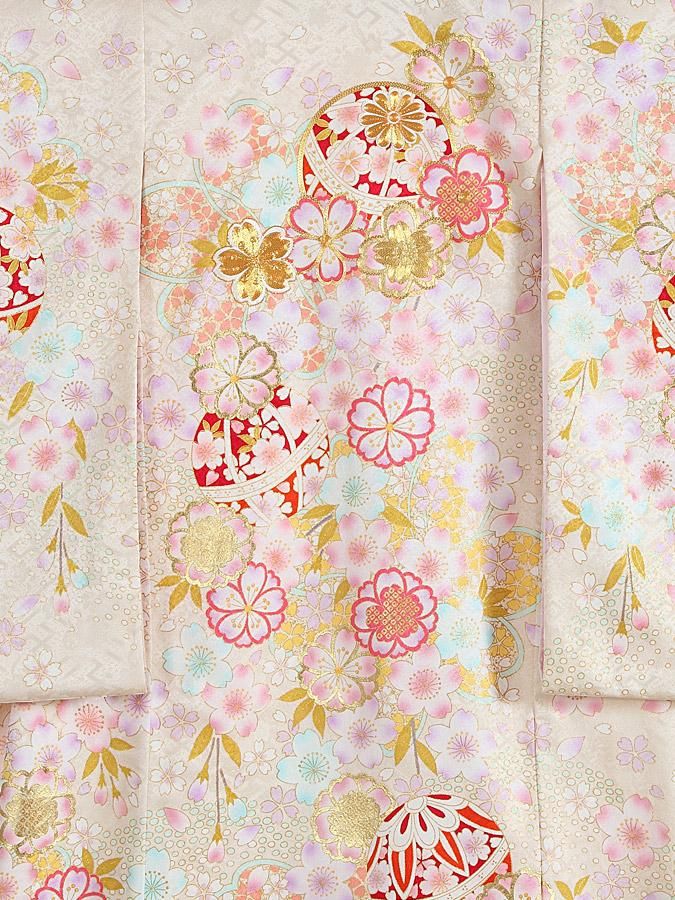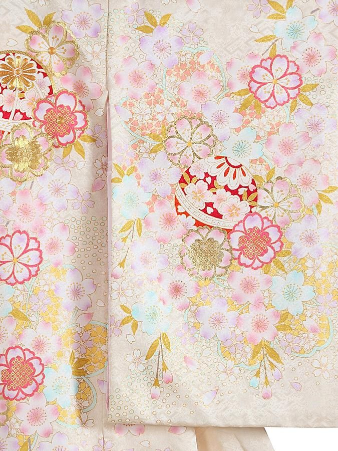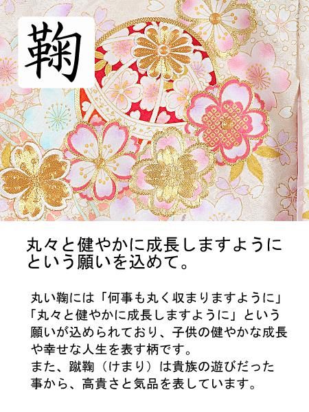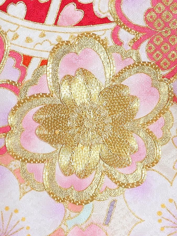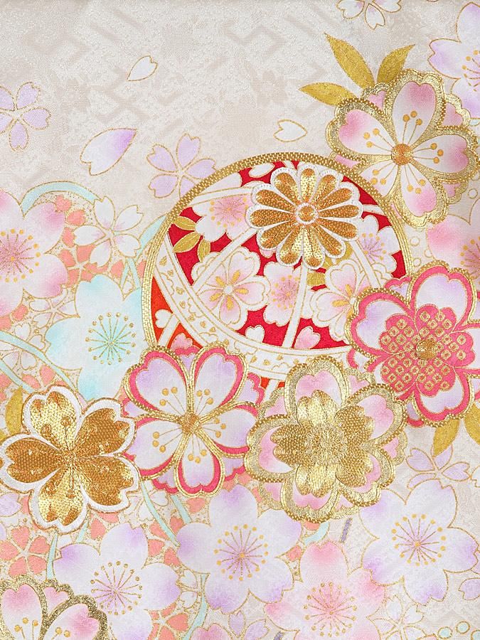 重厚な金駒刺繍が施された鞠や花々が目を引き、全体に散りばめられた淡い色の花々が、優しい雰囲気を演出しています。