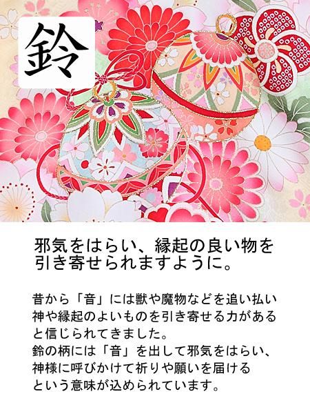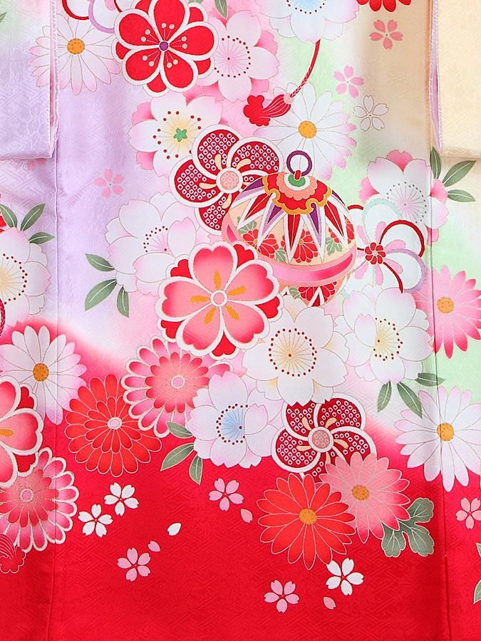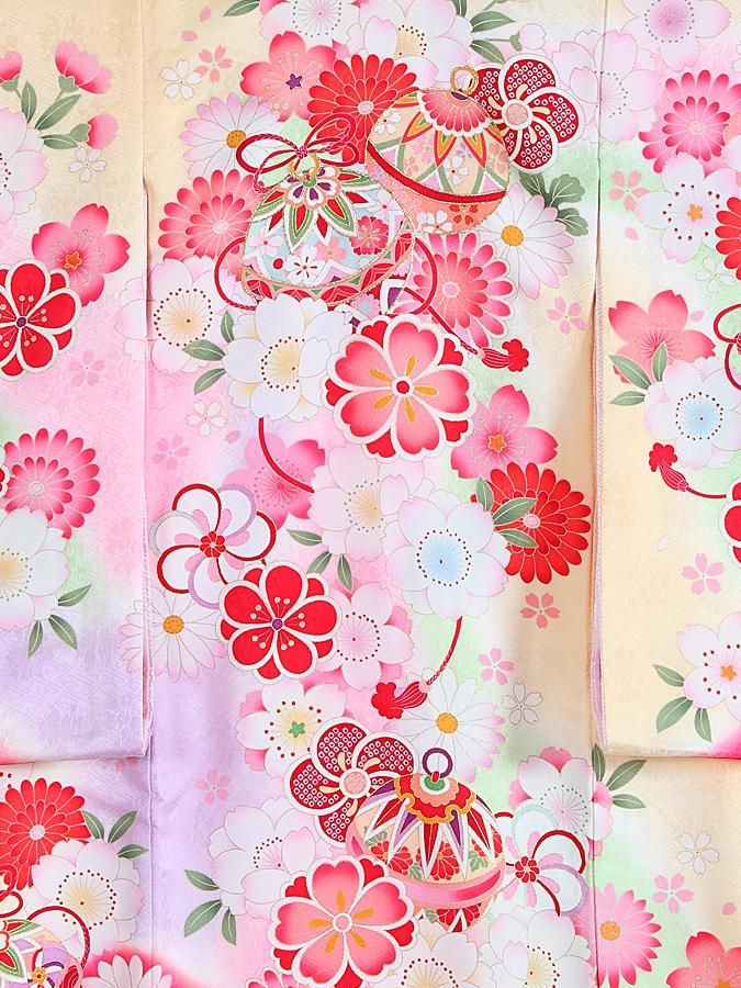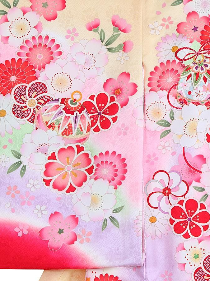 クリーム色の生地に紫やピンクが可愛らしく映える、地模様が施された高級産着です。背中の柄に施された金糸の縁取りや、大きめに描かれた花々が、華やかさを一層引き立てる一品です。