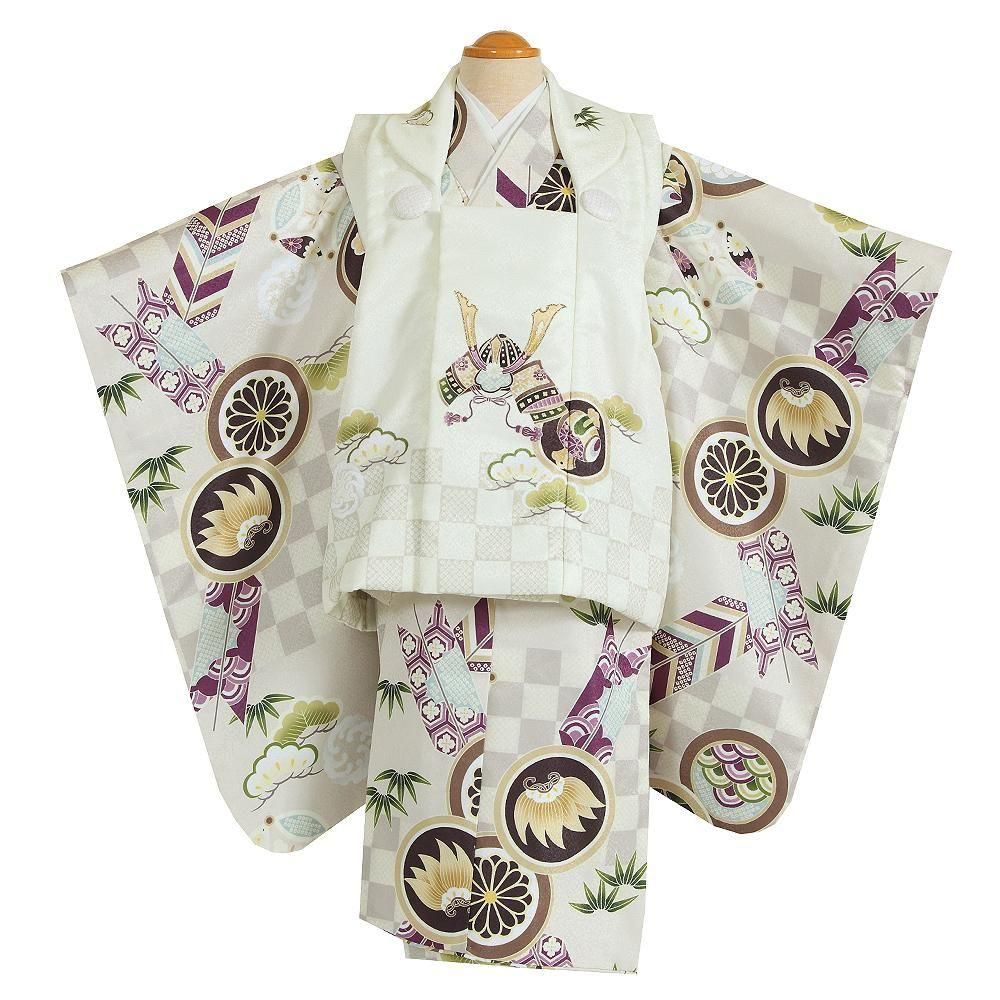 【七五三男児3歳被布レンタルセット】753B3-020 ベージュ×クリーム 兜 格子【往復送料無料】