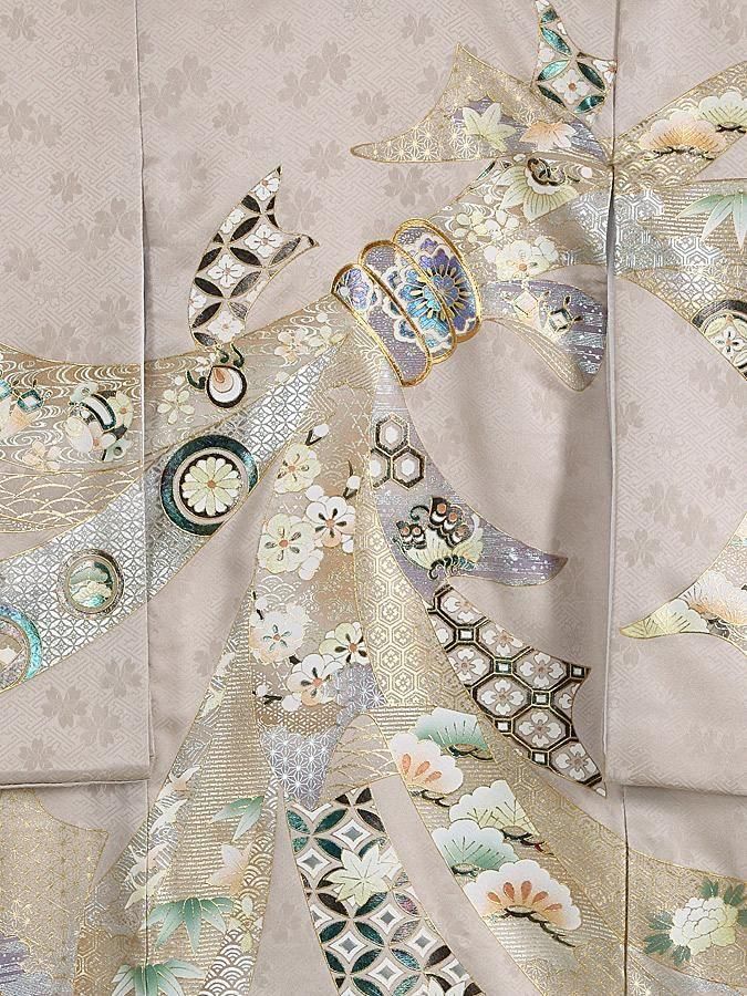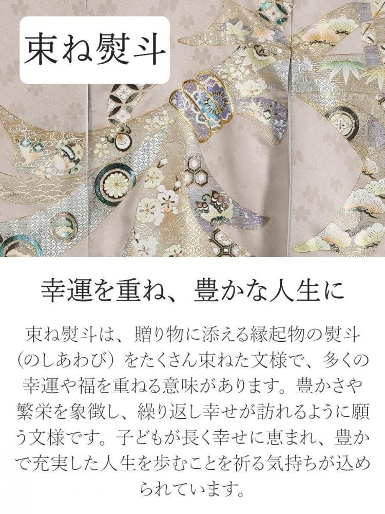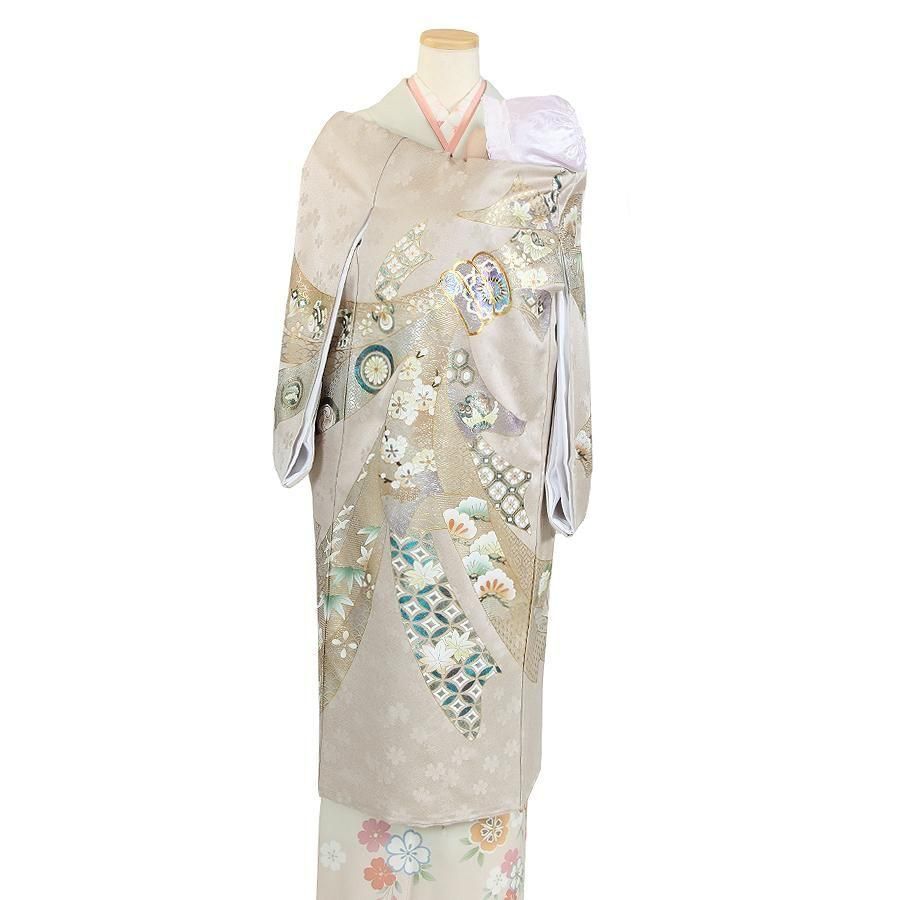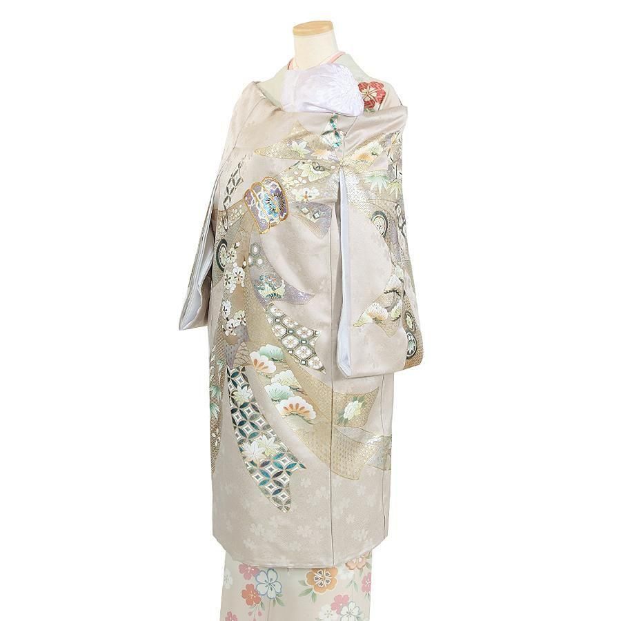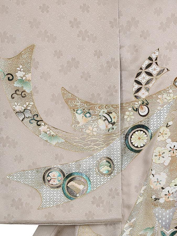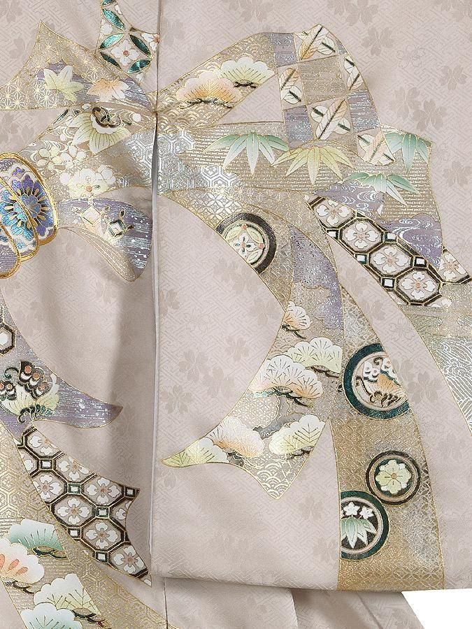 G0134正絹くすみ茶ベージュ地 京友禅 束ね熨斗