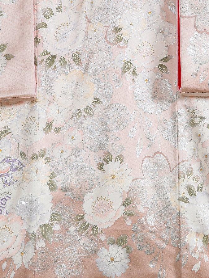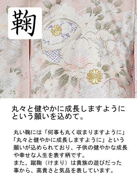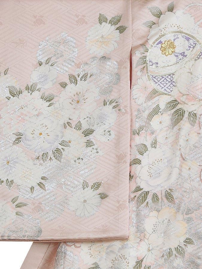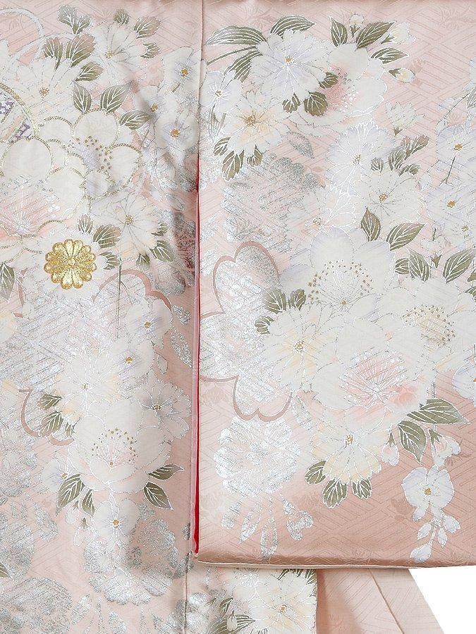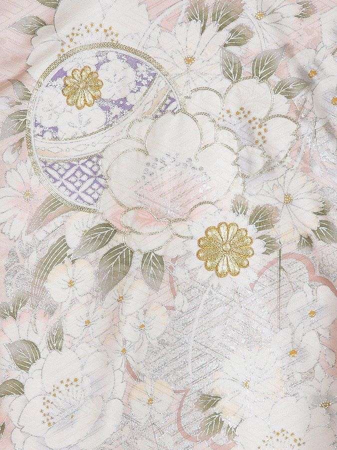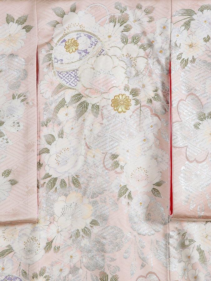 珍しいピンクベージュの上質な生地には地模様があり、高級銀彩加工が全体に施され、煌びやかな印象に。また、金駒・銀駒刺繍が施された鞠や花々が目を引く逸品です。