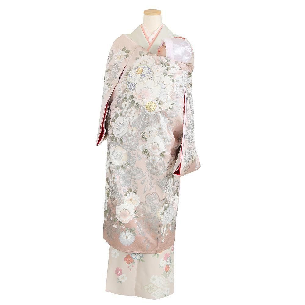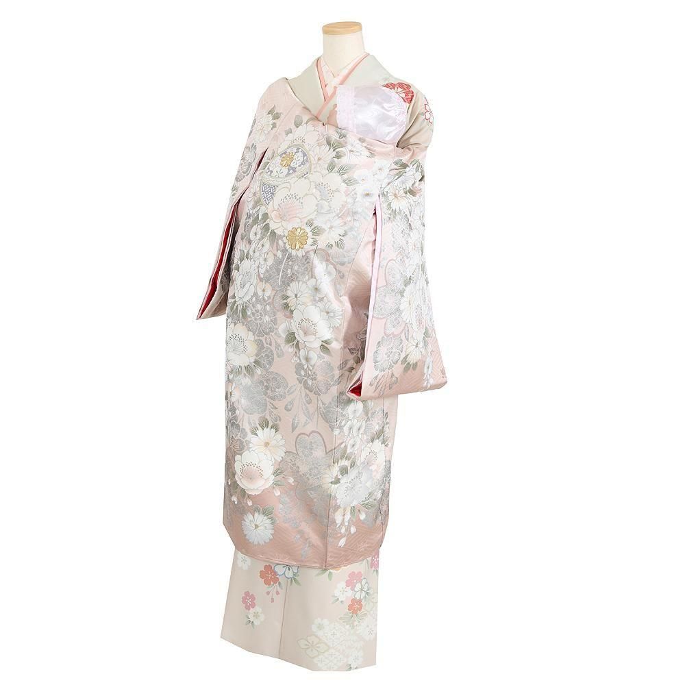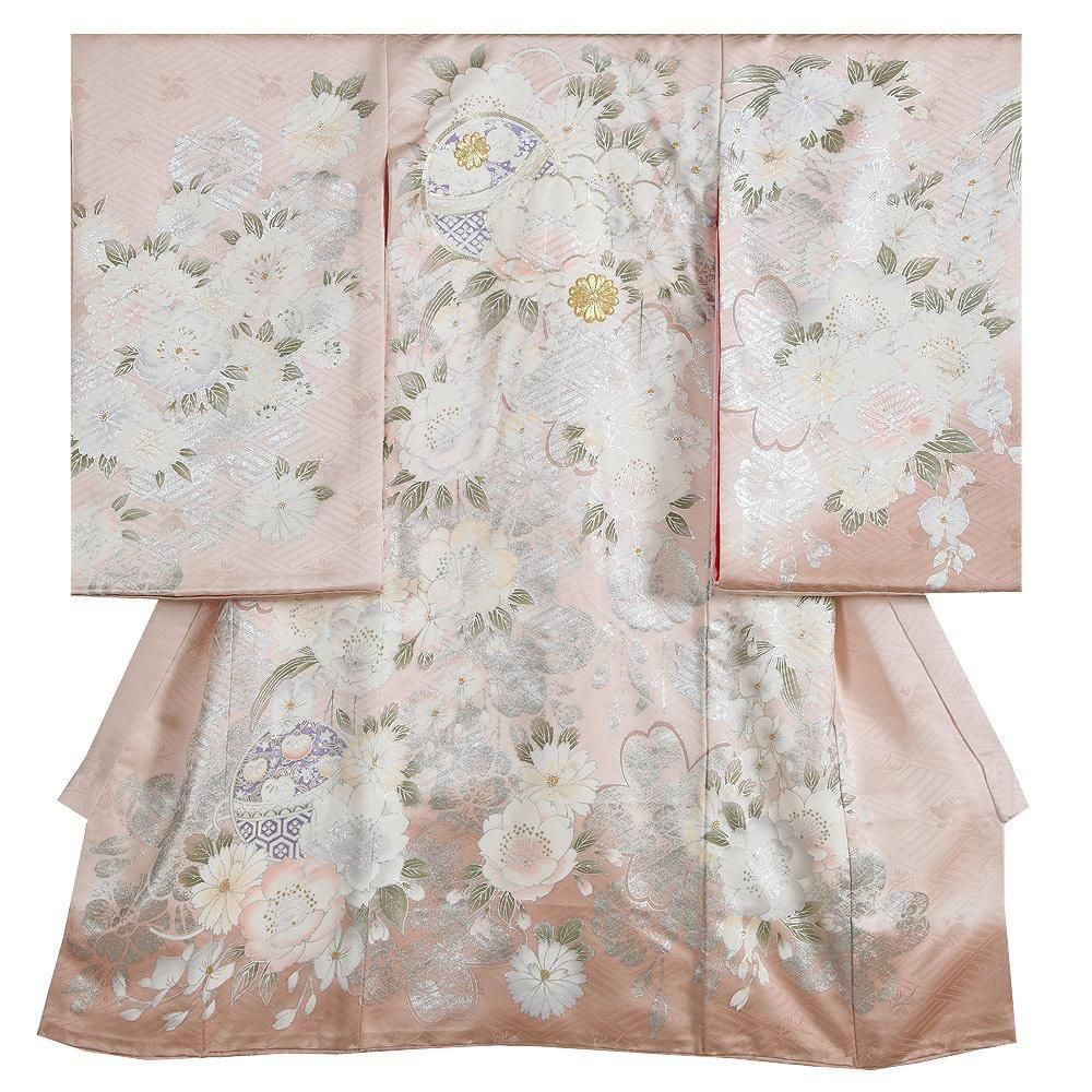 珍しいピンクベージュの上質な生地には地模様があり、高級銀彩加工が全体に施され、煌びやかな印象に。また、金駒・銀駒刺繍が施された鞠や花々が目を引く逸品です。