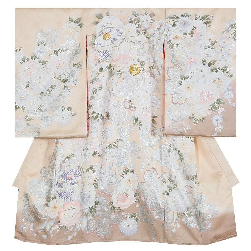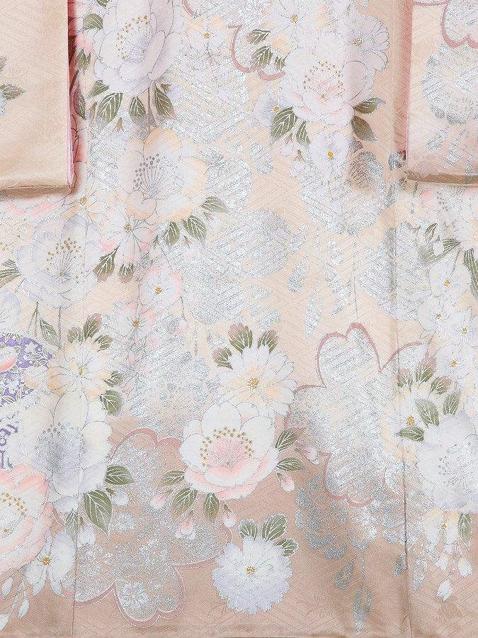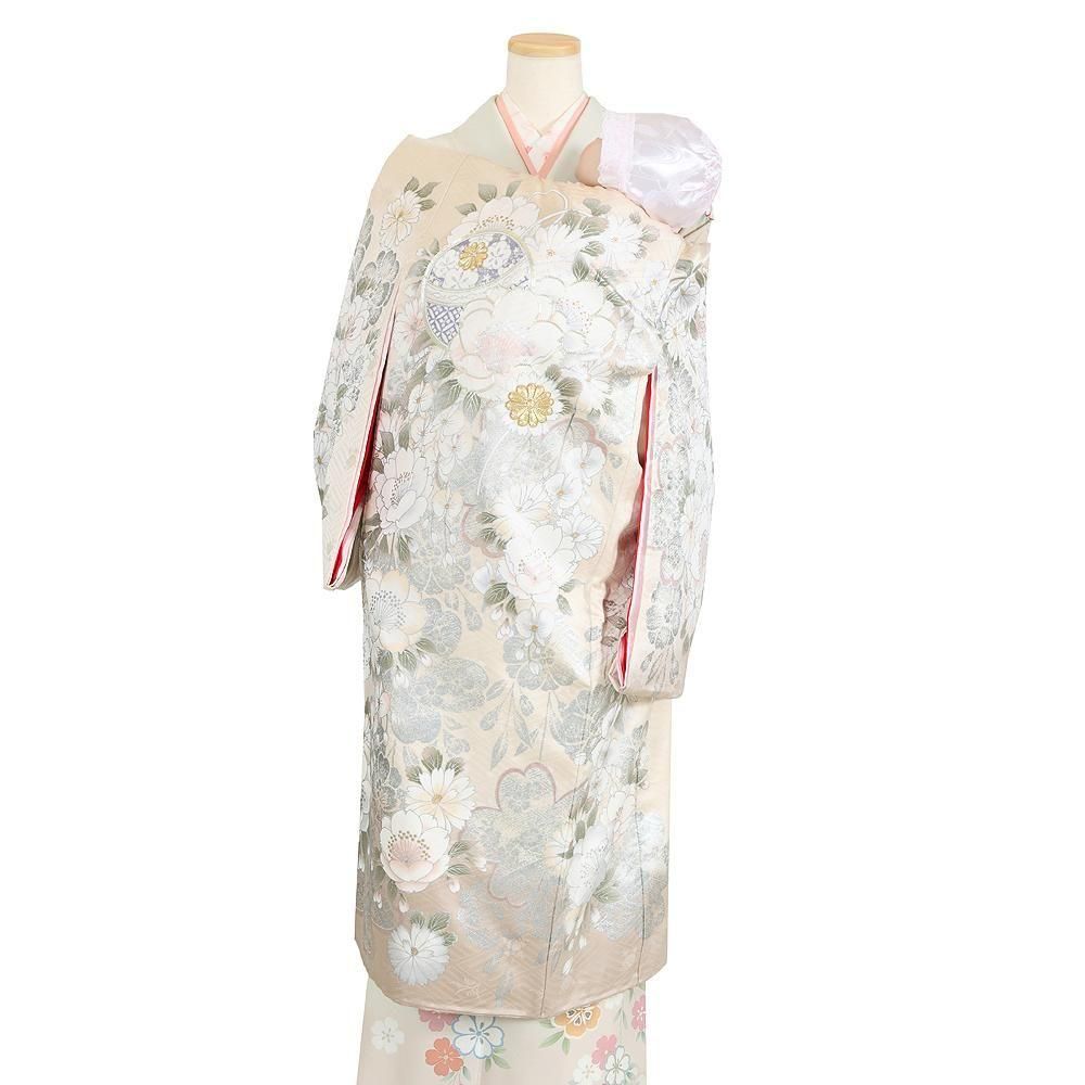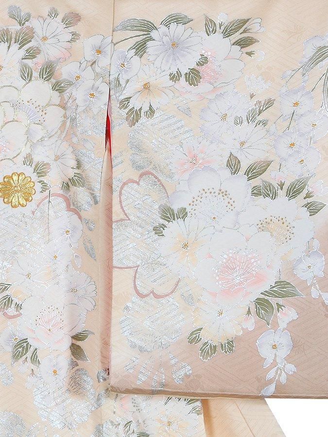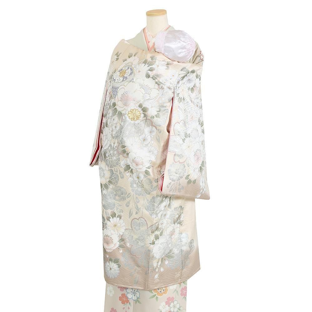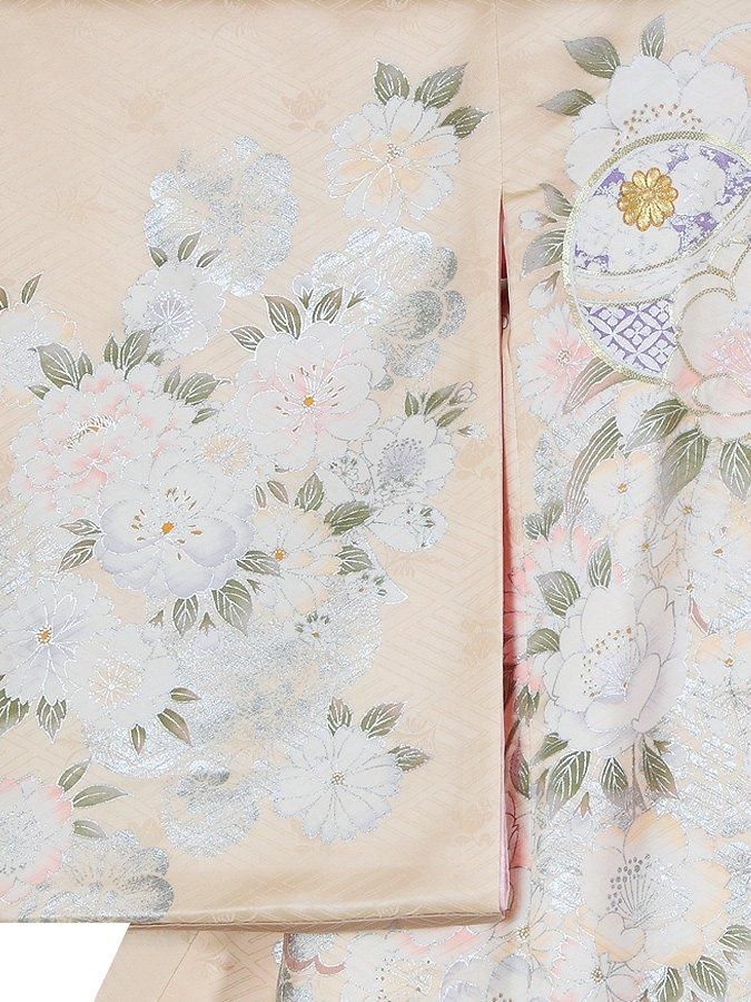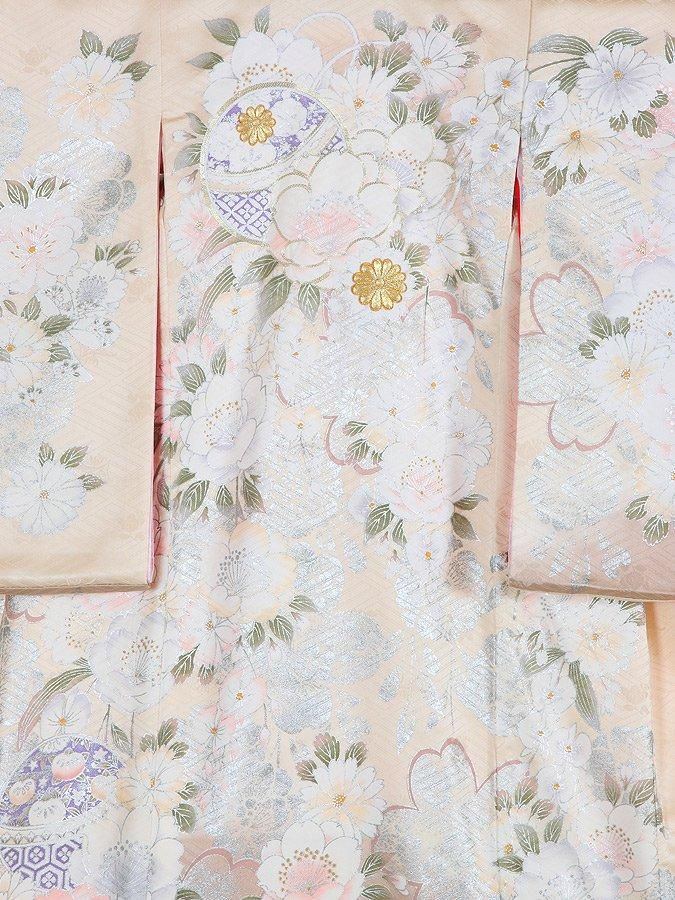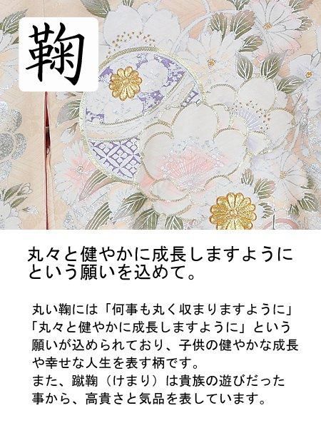 珍しいくすみベージュの上質な生地には地模様があり、高級銀彩加工が全体に施され、煌びやかな印象に。また、金駒・銀駒刺繍が施された鞠や花々が目を引く逸品です。