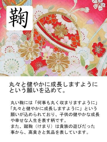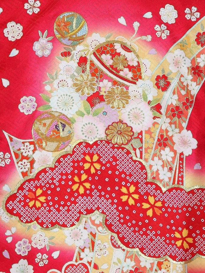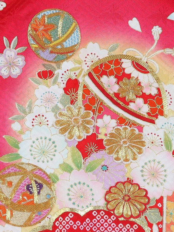 紗綾型と松竹梅の地模様が入った生地に、金駒刺繍が施された鞠や花が目を引く産着です。