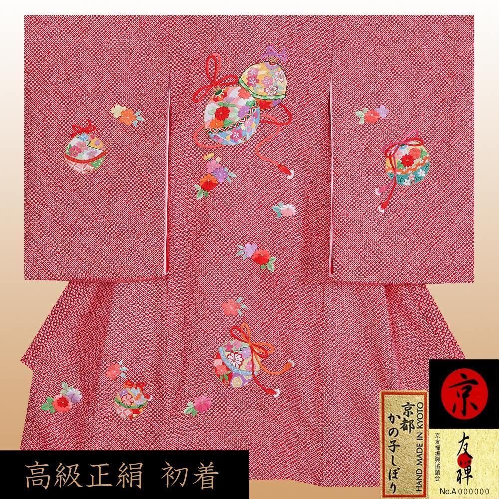 職人の手作業で絞り染められた「京都かの子しぼり」の産着です。着物全体を絞り染める「総絞り」に高級刺繍の鈴や花々が、とても豪華な逸品です。