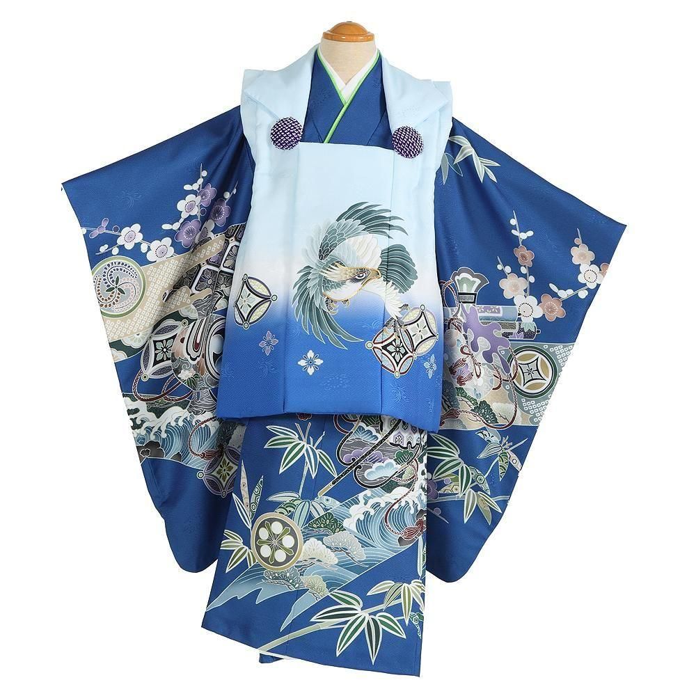 【七五三男児3歳被布レンタルセット】753B3-025 青×水色 金駒刺繍 鷹【往復送料無料】