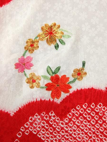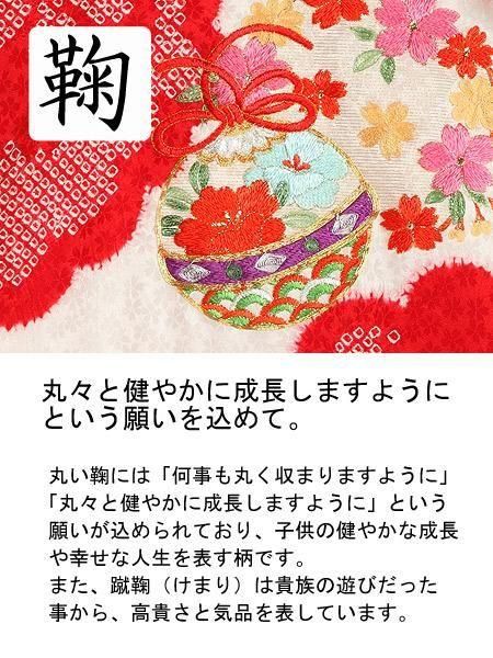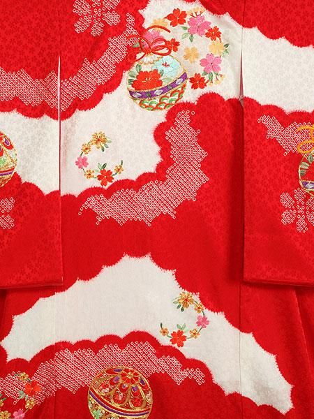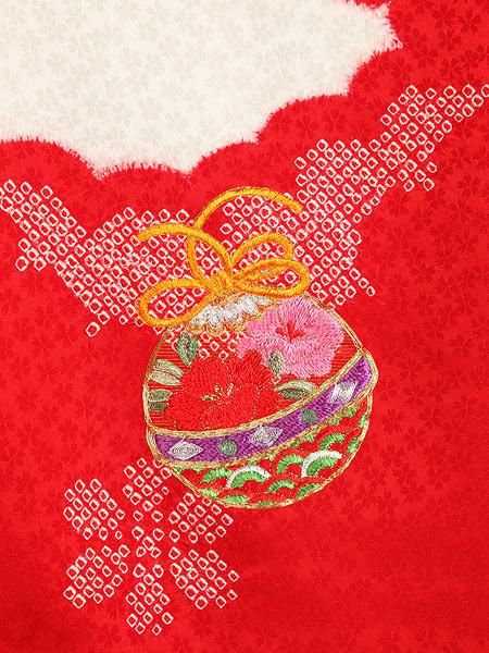 小花柄の地模様が入った生地に、本絞り染めが施された高級産着です。鞠や花の柄には金駒刺繍など全て刺繍が施されている、豪華な一品です。